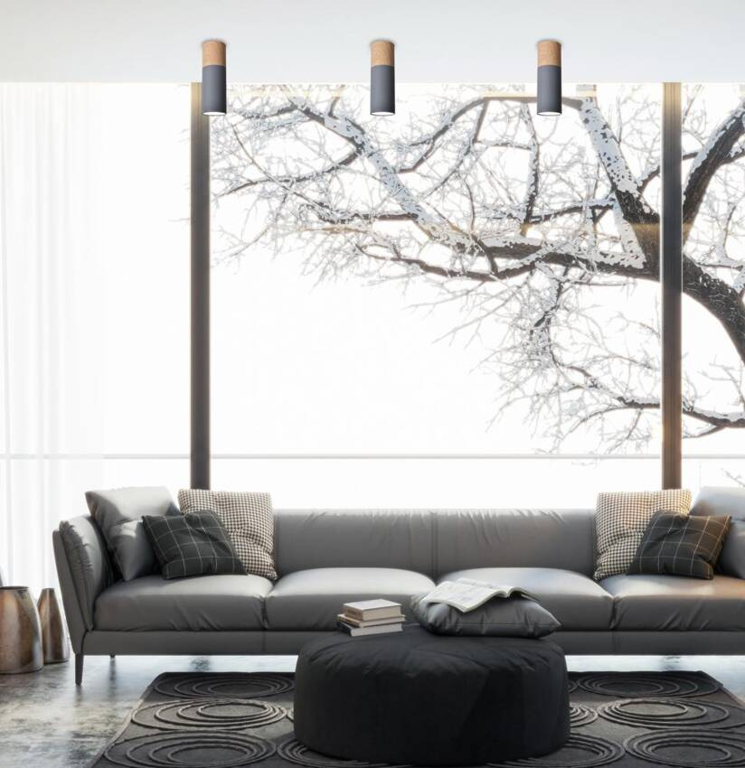 ,Lampa sufitowa wykonana z aluminium i wykończona w kolorze szarości i imitacji drewna. Tuba może być montowana pojedynczo, ale najlepiej prezentuje się w grupie kilku sztuk. Brak źródła światła w zestawie.
