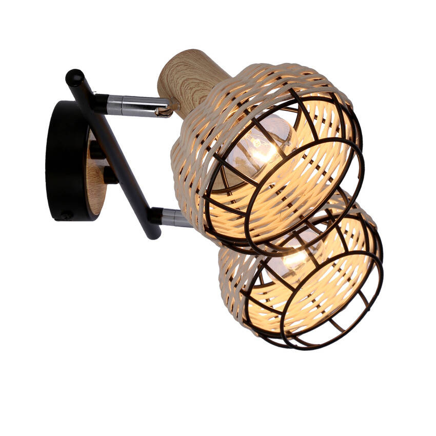 Lampa sufitowa jest wyposażona w dwa źródła światła o mocy 40W każde i standardowym gwincie E14. Klosze wykonane są z czarnego i drewnianego materiału, tworząc harmonijną kombinację, która dodaje ciepła i przytulności.