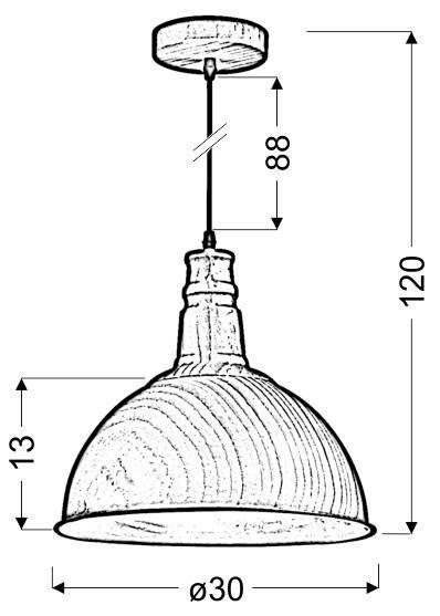 ,Klosz metalowy malowany, po stronie zewnętrznej imitujący powierzchnię drewnianą, wewnątrz jasny gładki. Idealnie sprawdzi się jako oświetlenie nad stołem lub barem. Dostępny również w wersji z kloszem talerzowym.