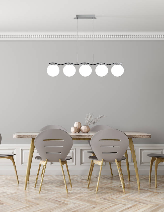 Lampa wisząca RAMON 35-01429 z pięcioma szklanymi kloszami, wykonana w nowoczesnym stylu, dzięki dużemu rozmiarowi, aż 86cm, dopasuje się do przestronnych wnętrz. Ciekawa falowana podstawa wykonana jest z metalu. Lampa wyposażona jest w 5 białych kloszy. Do zastosowania z żarówkami o trzonku G9 o max mocy 40W (4W LED) (brak w zestawie). Zalecamy stosowanie oszczędnych źródeł światła LED o dużej żywotności.