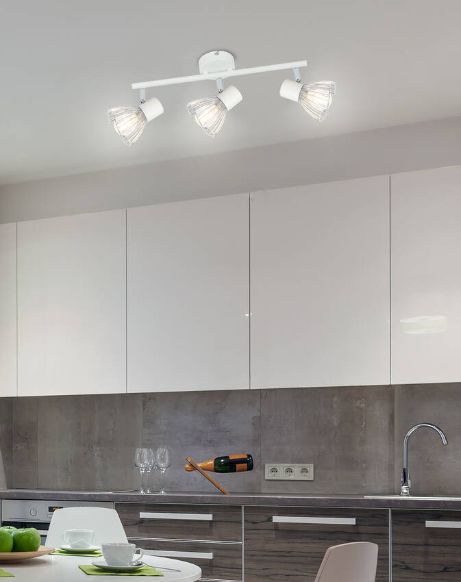 ,Skromny i subtelny; wykończony w kolorze białym z chromowymi wstawkami, abażur ażurowy, zapewniający maksymalne wykorzystanie mocy źródła światła; możliwość regulacji kąta nachylenia klosza; do kompletu: kinkiet, listwa 2 oraz plafon 3; dostępny w trzech wersjach kolorystycznych: biały z chromem, czarny, czarny ze złotym;