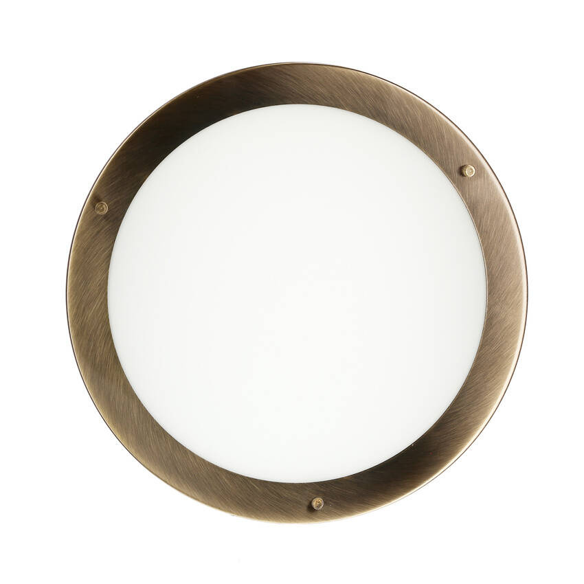 ,Plafon bryzgoszczelny - eleganckie połączenie metalu i szkła. Biały klosz gięty otoczony metalowym ringiem. Idealny na przedpokój, do kuchni i łazienki. Podwyższona szczelność IP44 pozwala na montaż w łazienkach w obszarach II strefy użytkowania, czyli w bezpośredniej bliskości wanien i pryszniców. Dostępny w czterech wersjach kolorystycznych podstaw (patyna, satyna, miedziany i biały) i trzech rozmiarach.