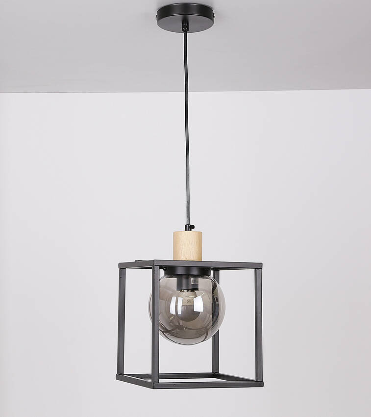 ,Lampa z metalową podsufitką w kolorze czarnym oraz metalowym kloszem z elementami drewna i okrągłym dymionym kloszem w stylu loft. Wyposażona jest w oprawkę E27 o maksymalnej mocy 40W (żarówka nie dołączona), można zastosować żarówkę LED. Posiada możliwość regulacji wysokości poprzez wciągnięcie kabla i umieszczenie go w podsufitce bądź poprzez skrócenie.