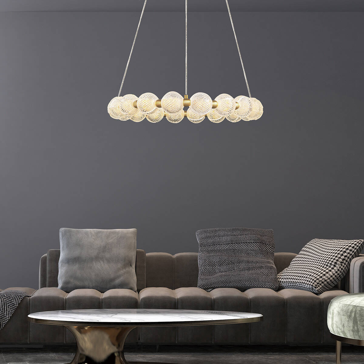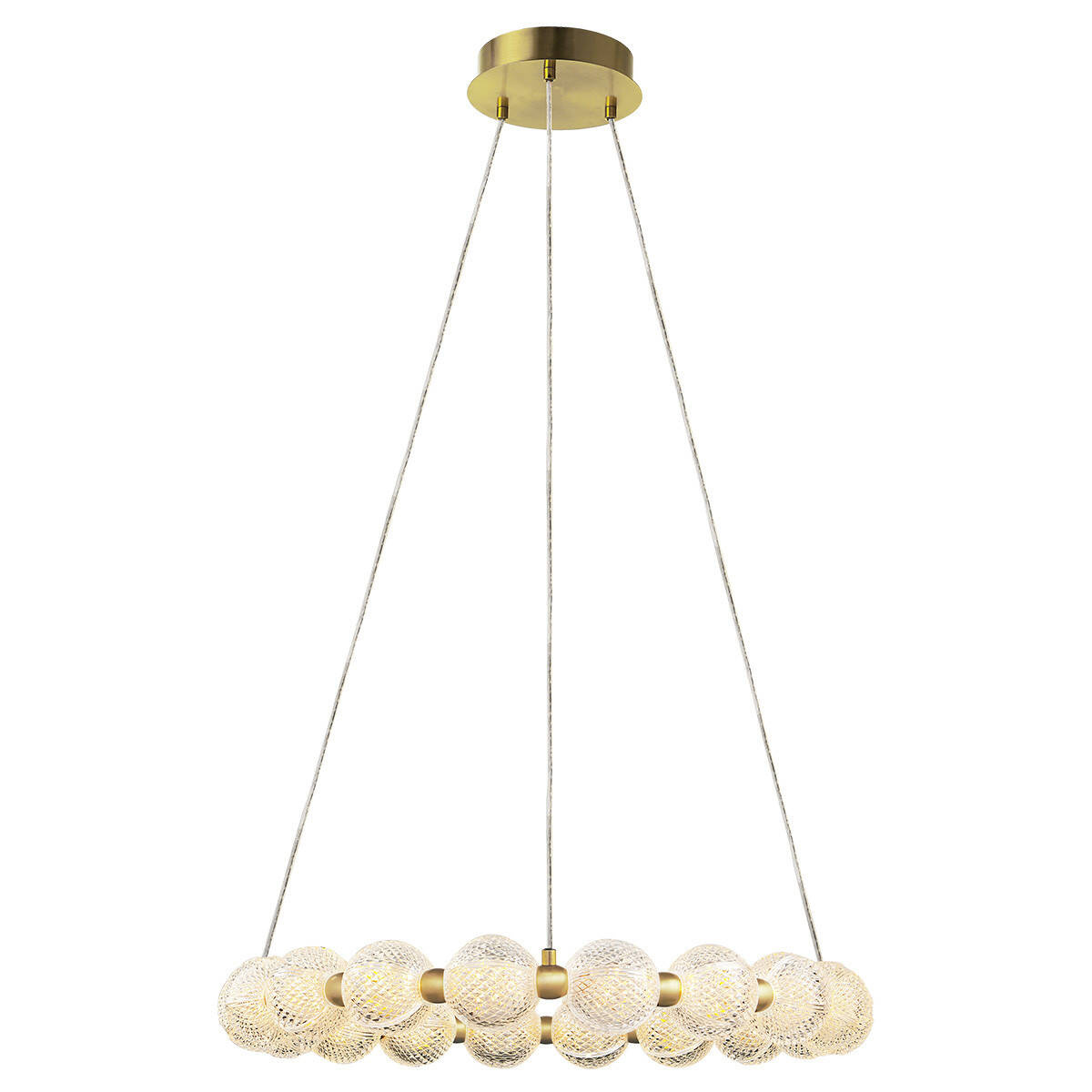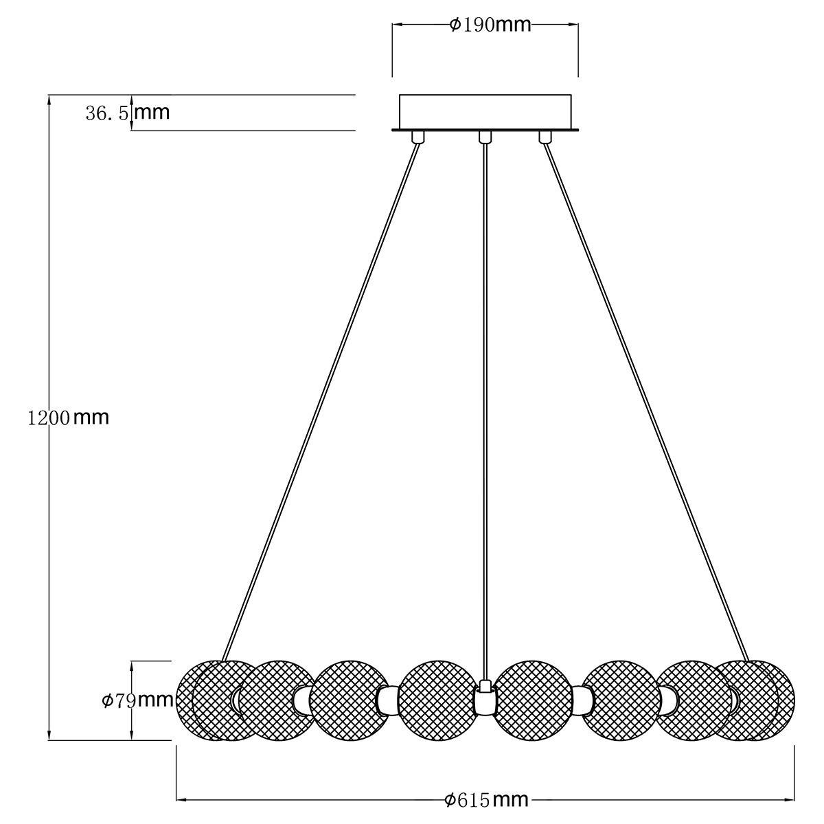 Konstrukcja lampy wiszącej Diamond wykonana została z metalu w złotym odcieniu, uzupełniona akrylowymi kloszami o kryształowym wykończeniu, co nadaje jej niepowtarzalny urok oraz elegancję. Projektanci zadali sobie trud, aby każdy szczegół był perfekcyjnie dopracowany. Transparentny kabel doskonale komponuje się z resztą elementów lampy, tworząc spójną całość.