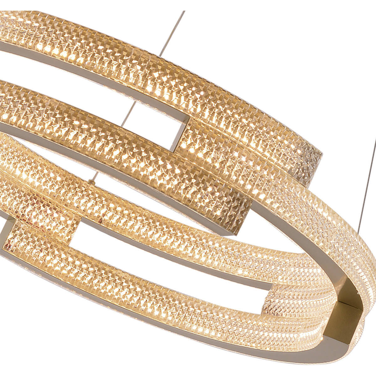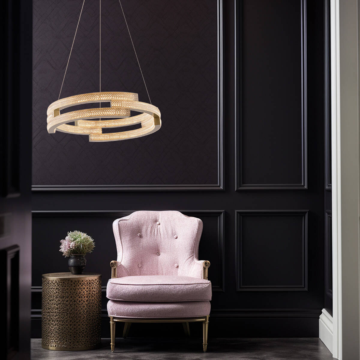 Lampa wisząca Tarja została wykonana z metalu w złotym kolorze z elemntami akrylu imitującego kryształ. Lampa stanowi niezwykle ozdobny element dekoracyjny. Ze względu na swoje imponujące rozmiary będzie doskonałym wyborem do dużych, przestronnych pomieszczeń takich jak salon, sypialnia, jadalnia. Kształt i kolorystyka lampy sprawiają, że lampa ta bedzie idealnym wyborem do wnętrz w nowoczesnym stylu, stylu glamour oraz modnym aktualnie modern classic. Lampa posiada wbudowane światło LED o zmiennej barwie światła. Barwę światła ustawia się przed montażem w podsufitce lampy. Do wyboru mamy ciepłą, neutralną lub zimną barwę światła.