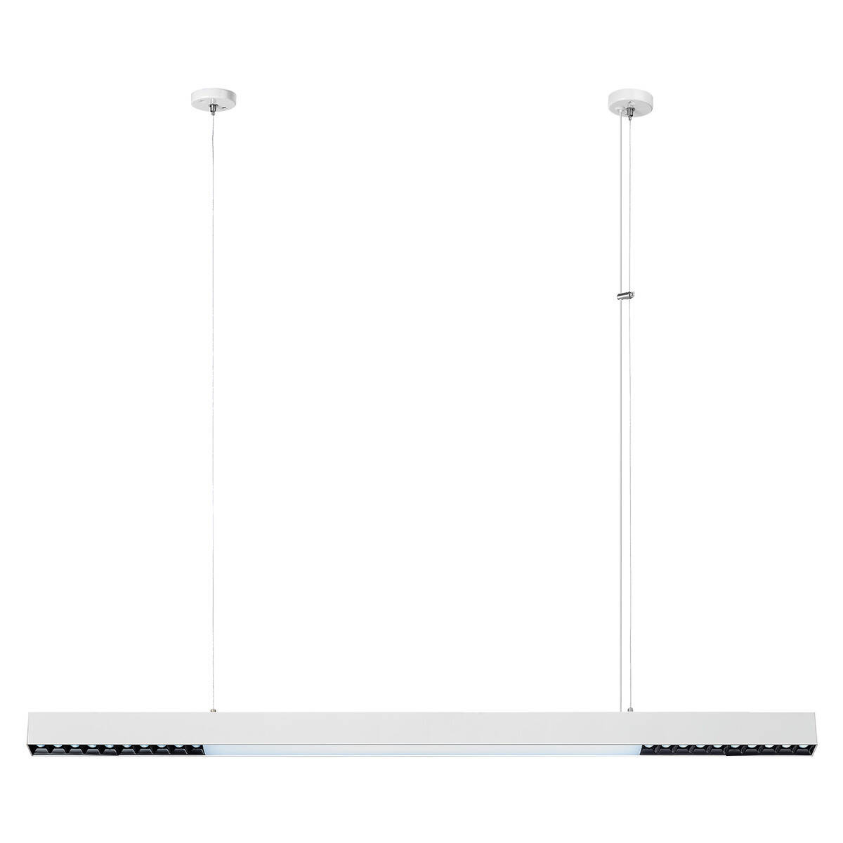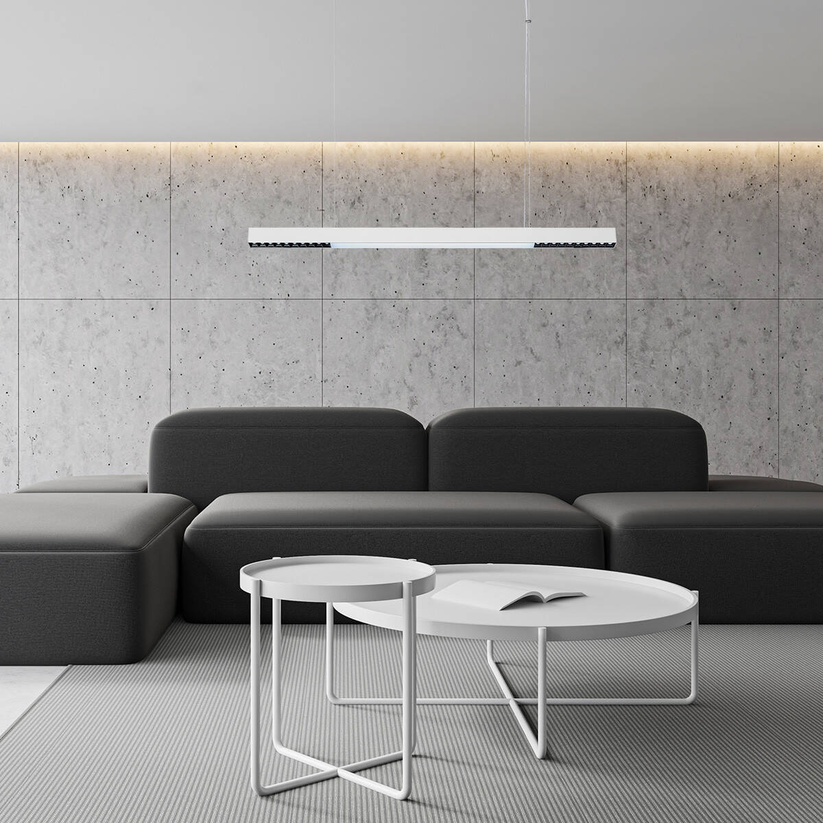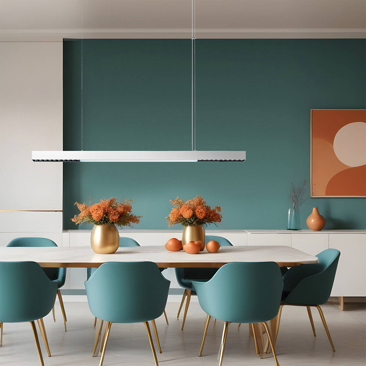 Lampa łączy w sobie nowoczesny design i zaawansowaną technologię. Lampa wykonana jest z trwałego aluminium w białym kolorze, co nadaje jej nowoczesny i elegancki wygląd. Kształt podłużnego prostopadłościanu oraz połączenie miniaturowych reflektorków z gładką, akrylową blendą sprawiają, że lampa stanowi nie tylko źródło światła, ale również interesujący element dekoracyjny. Lampa zawieszana jest na regulowanych linkach, których maksymalna długość wynosi 120 cm, umożliwiając dostosowanie wysokości do indywidualnych potrzeb. Zaawansowana technologia LED CCT pozwala na regulację barwy światła, dzięki czemu można dopasować oświetlenie do każdej sytuacji i nastroju. Lampa oferuje możliwość sterowania za pomocą aplikacji Tuya Smart, co umożliwia łatwe i wygodne zarządzanie oświetleniem z dowolnego miejsca w domu. Ta lampa to idealne rozwiązanie dla osób ceniących nowoczesne technologie i prosty design.