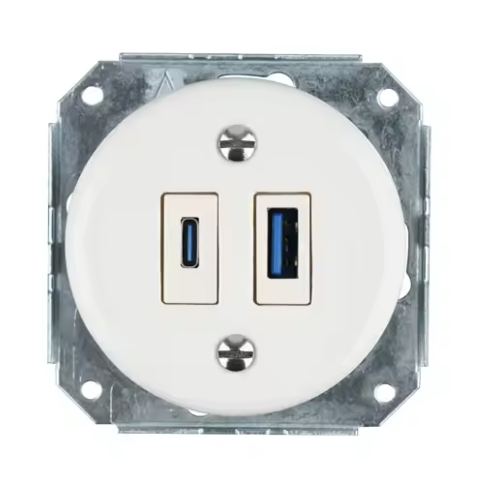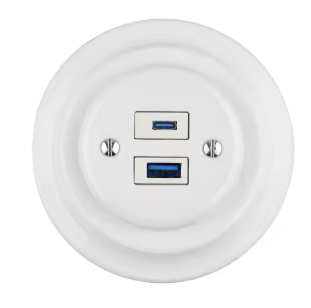 Gniazdo ceramiczne podtynkowe USB + C białe retro bez ramki