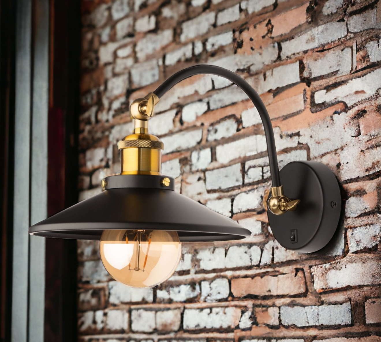 Kinkiet metalowy Retro na łuku czarno złoty płaski z włącznikiem