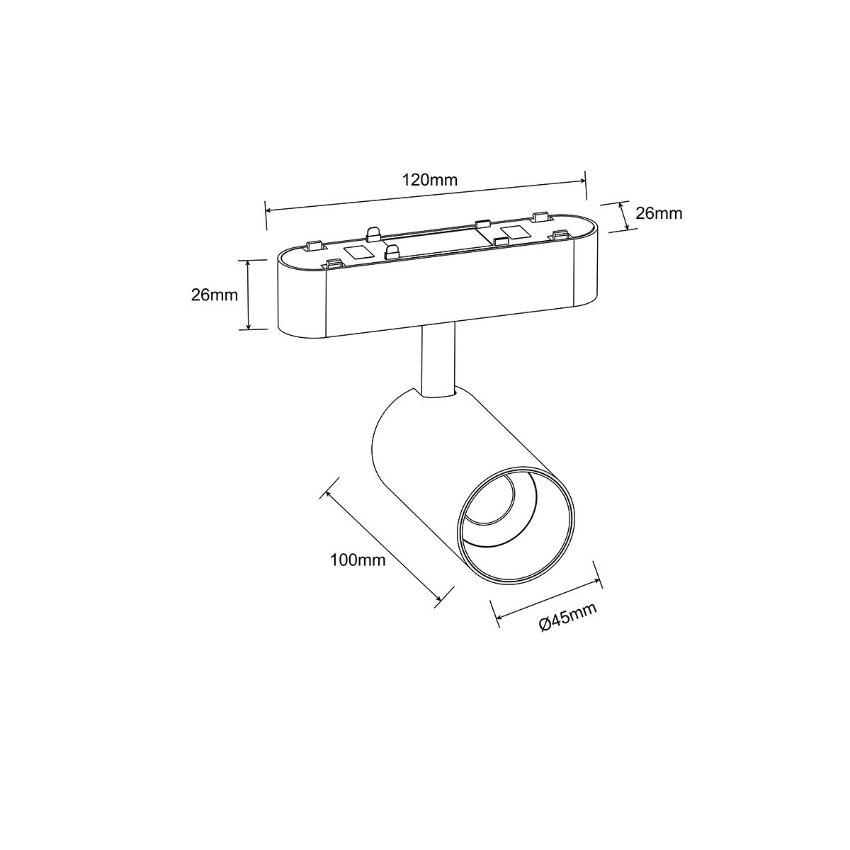 Wymiary: Długość klosza wynosi 10 cm, średnica klosza wynosi 4,5 cm. Szerokość podsufitki to 12 cm, natomiast jej wysokość i głębokość to 2,6 cm.