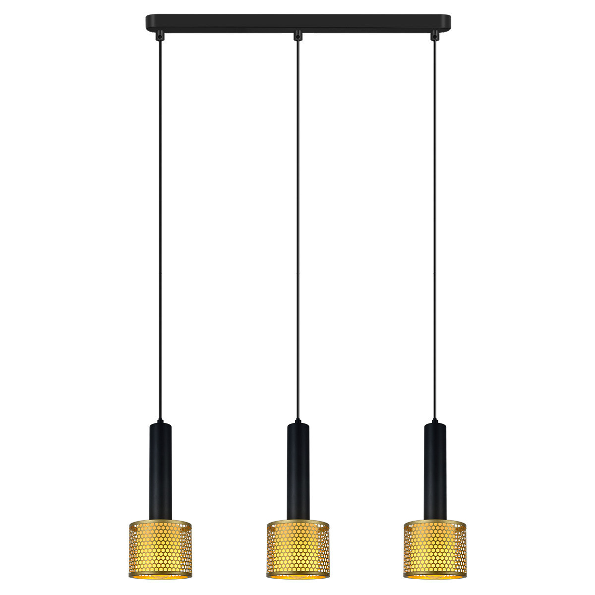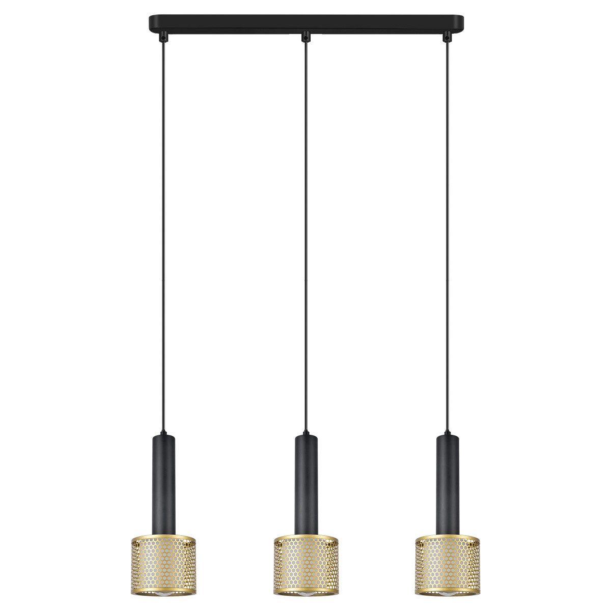 Czarno-złota lampa wisząca z trzema kloszami to elegancka kombinacja nowoczesnego designu i industrialnego stylu. Wykonana z metalu, stanowi stylowy element, który doskonale uzupełnia wnętrza urządzone w nowoczesnym duchu. Trzy cylindryczne klosze nadają lampie charakterystyczny wygląd, a ich ażurowa struktura pozwala na subtelną grę światła, tworząc ciepłą i przytulną atmosferę.