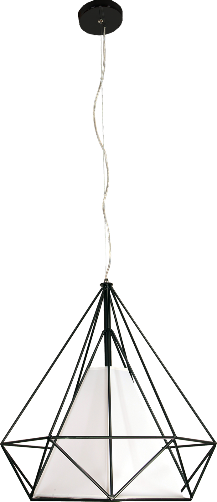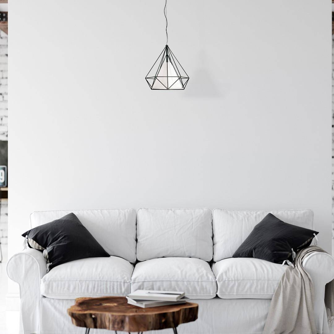 Model TRIANGOLO to piękna lampa w klimacie vintage. W czarnej, drucianej, geometrycznej oprawie umieszczono biały klosz, przez który przebija się światło. Żarówka nie jest zatem widoczna. Ten model doskonale będzie pasował do jadalni czy pokoju dziennego. W jasnym wnętrzu, ze względu na swój kolor, będzie elementem wyróżniającym. Lampa doskonale prezentuje się w połączeniu z innymi modelami z tej kolekcji.