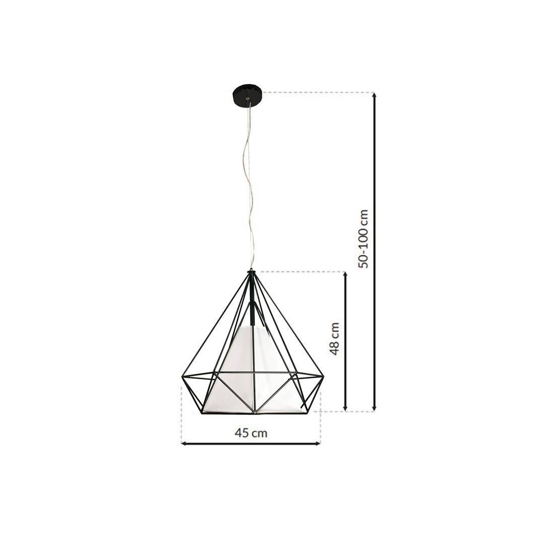 Lampa TRIANGOLO jest modelem wiszącym wykonanym z dwóch bardzo wytrzymałych i bezpiecznych tworzyw: PVC oraz metalu. Między innymi dlatego model ten przypisano do klasy ochronności IP20. Lampa ma jedno źródło światła. Zainstalowany w nim gwint E27 pozwala na użycie właściwie każdej żarówki: LEDowej oraz tradycyjnej, o klasach energetycznych od A++ do E. Wartość napięcia znamionowego, przy jakim pracuje ten model wynosi 230 V, a moc ma wartość 40 W. Szerokość lampy wynosi 45 cm, a jej wysokość jest regulowana na przewodzie i może wynosić do 120 cm.