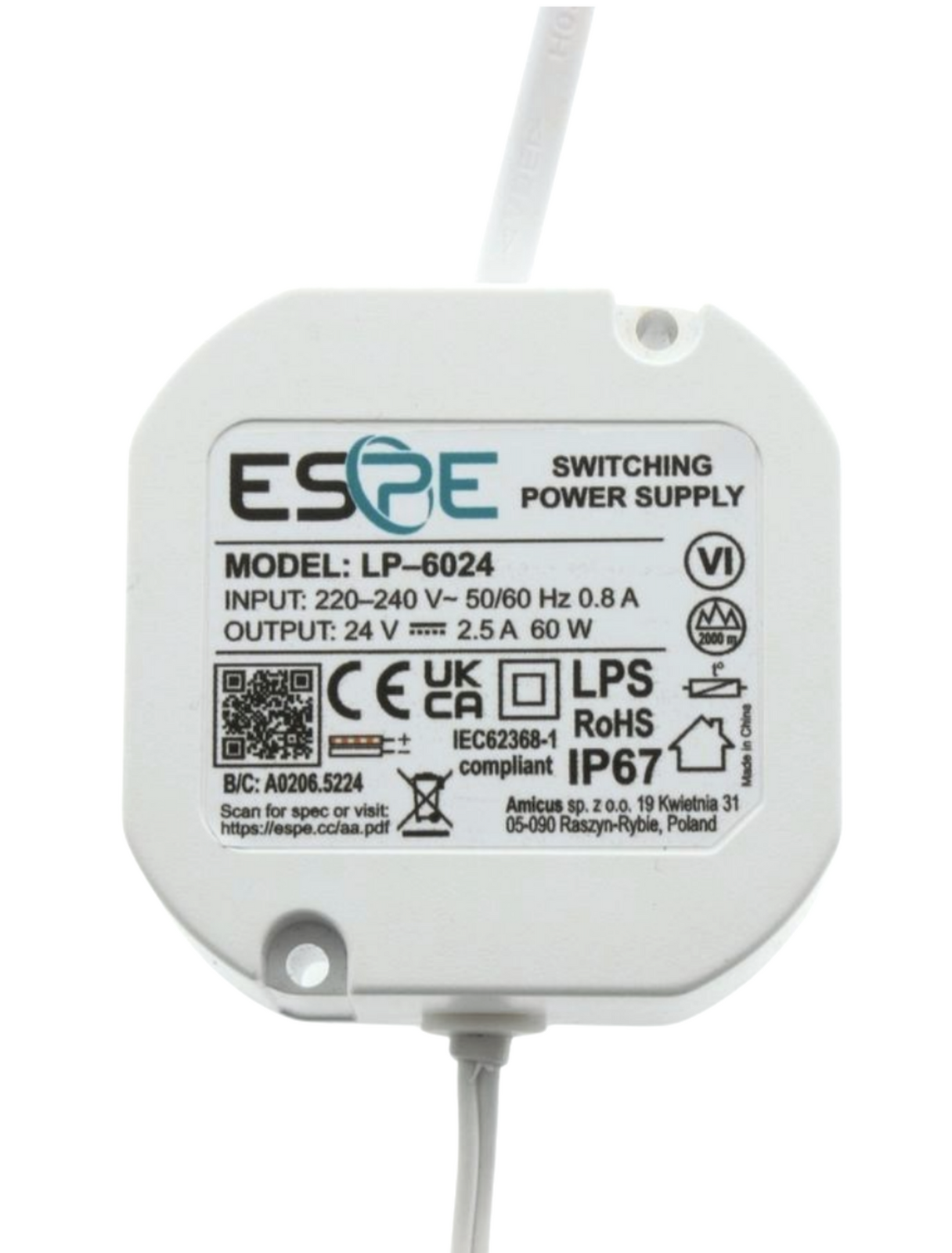 Zasilacz dopuszkowy do Led 24V 1,25A 60W wodoszczelny IP67 ESPE