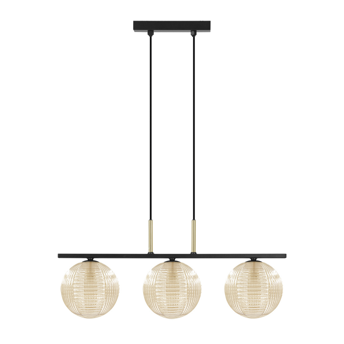 Lampa K-5687 GIRO to nowoczesny wybór, który wyróżnia się subtelnym połączeniem eleganckiego, czarnego, metalowego stelaża oraz transparentnych, bursztynowych kloszy. Klosze wykonane z wysokiej jakości szkła dodają lampie lekkości i wyjątkowego charakteru, rozpraszając światło w sposób przyjemny dla oka. To doskonała lampa wisząca, idealna do jadalni, nad stół kuchenny czy wyspę kuchenną. Wyróżnia ją również złote wykończenia, które nadają całości luksusowego wyglądu. Proszkowo malowana armatura zapewnia trwałość, odporność na uszkodzenia oraz estetyczny wygląd na długi czas. Lampa ma maksymalną wysokość 90 cm, którą można dostosować do indywidualnych potrzeb, a jej szerokość wynosi 53 cm, co sprawia, że doskonale pasuje do większych przestrzeni.