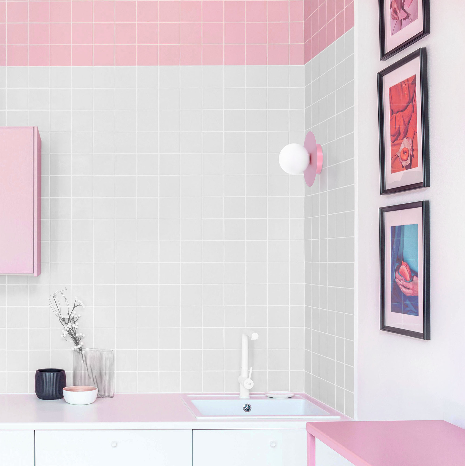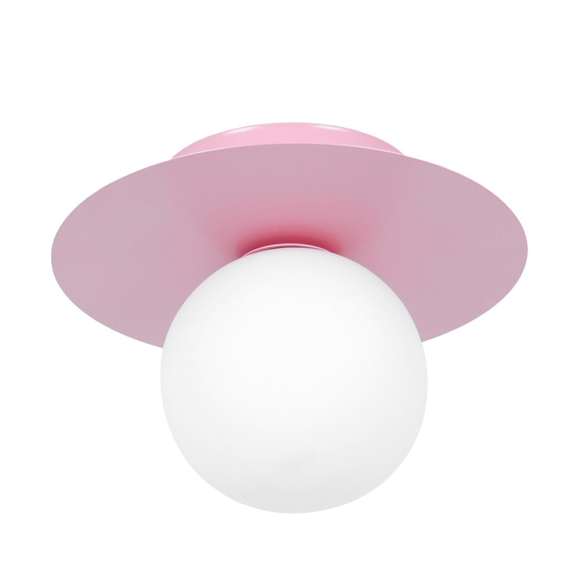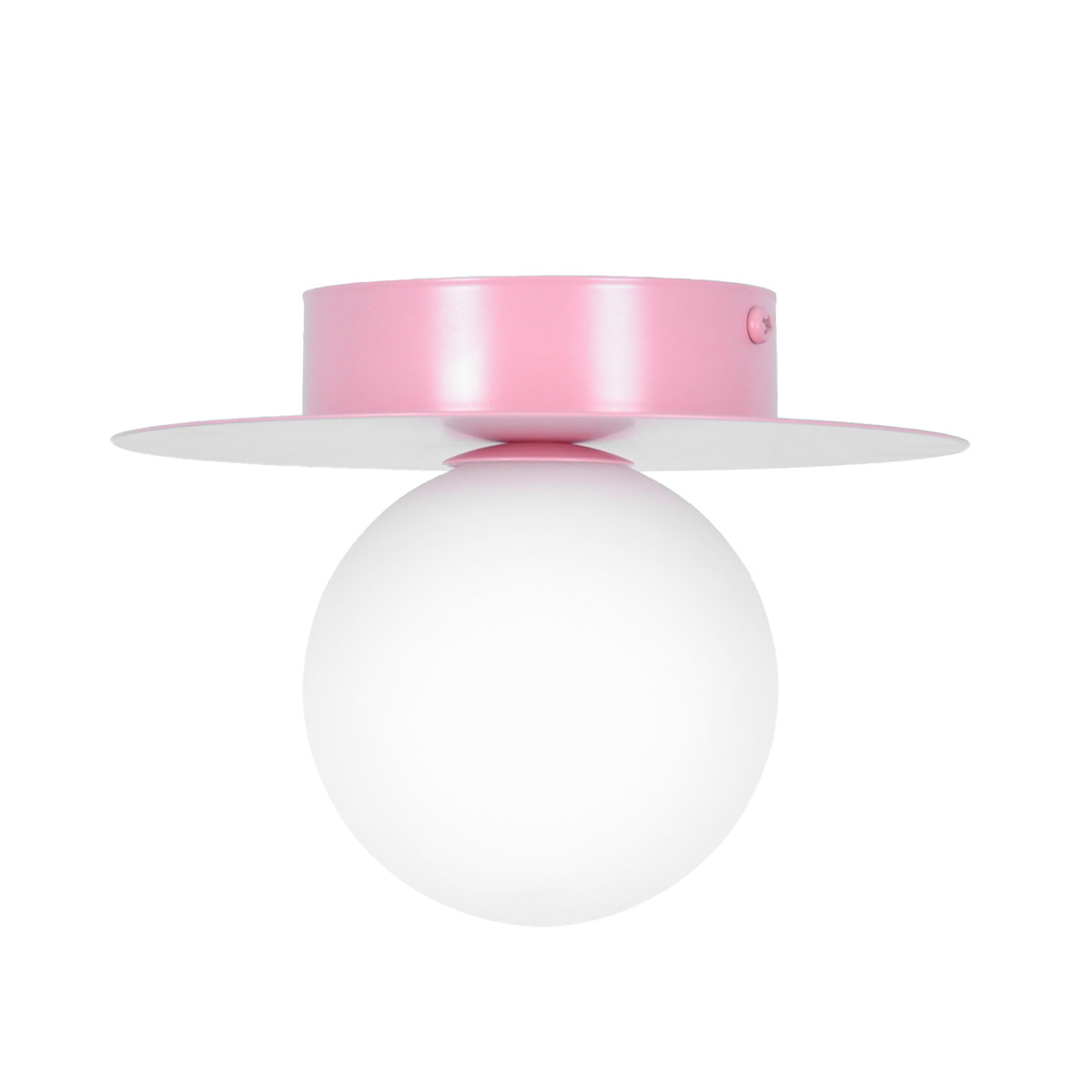 Lampa składa się z metalowej, różowej podstawy w kształcie okręgu o szerokości 18cm oraz subtelnego, mlecznego klosza. Materiały z których została wykonana zapewniają jej długowieczność i odporność na uszkodzenia. Szklany klosz w kolorze mlecznobiałym nadaje lekkości całości, a jednocześnie sprawia, że światło jest równomiernie rozprowadzane po całym wnętrzu.