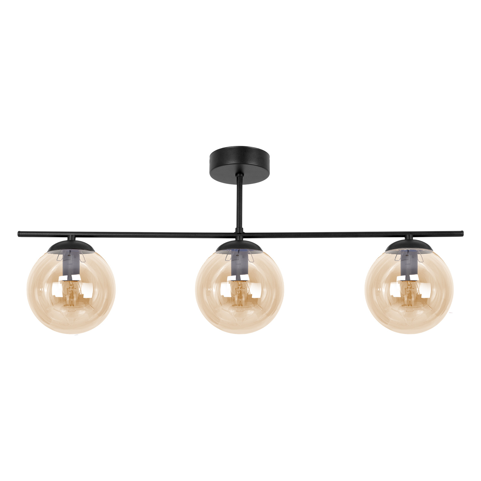 Ta lampa sufitowa ma nowoczesny, minimalistyczny design, który nadaje wnętrzu elegancki i stylowy wygląd. Składa się z trzech głównych punktów świetlnych, które są zawieszone na poziomej belce. Każdy z tych elementów to szklana kula w kolorze bursztynowym, co dodaje ciepłego i przytulnego światła. Kule są półprzezroczyste, co pozwala na swobodne rozproszenie światła i tworzenie przyjemnej atmosfery w pomieszczeniu.