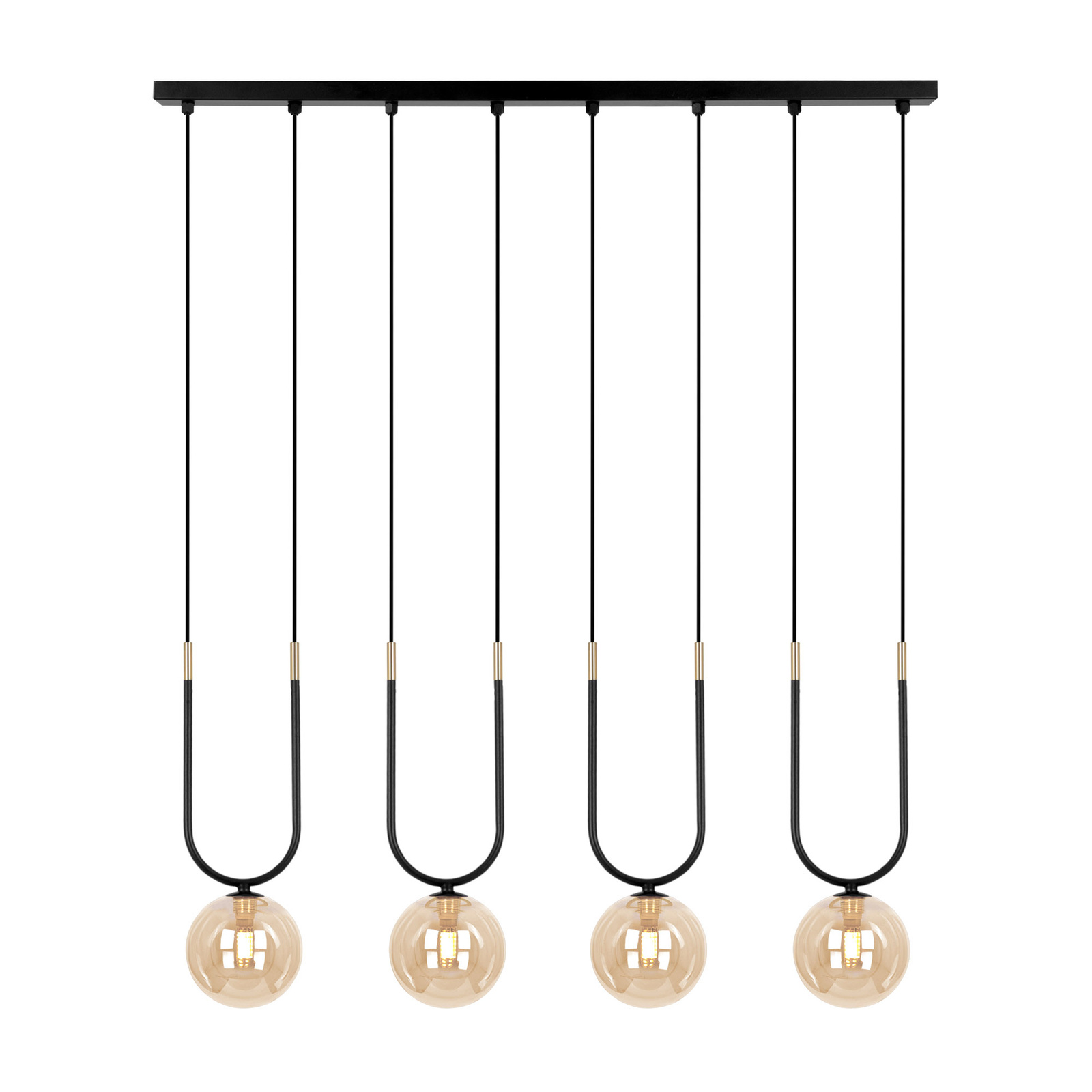 Lampa wisząca K-5597 z serii GOLDI to doskonała propozycja dla osób, które cenią sobie nowoczesny design oraz luksusowe wykończenie. Dzięki swojej konstrukcji, łączącej czarny metal ze złotymi detalami, lampa wprowadza elegancję do każdego wnętrza. Forma belki z czterema bursztynowymi, szklanymi kulami stanowi efektowny akcent, który doskonale sprawdzi się zarówno w salonie, jak i jadalni czy kuchni, a także nad wyspą kuchenną, nadając przestrzeni wyjątkowy charakter. Jest to lampa, która pełni funkcję oświetlenia, ale także stanowi dekoracyjny element w aranżacji wnętrz, wpisując się w styl glamour i nowoczesny.