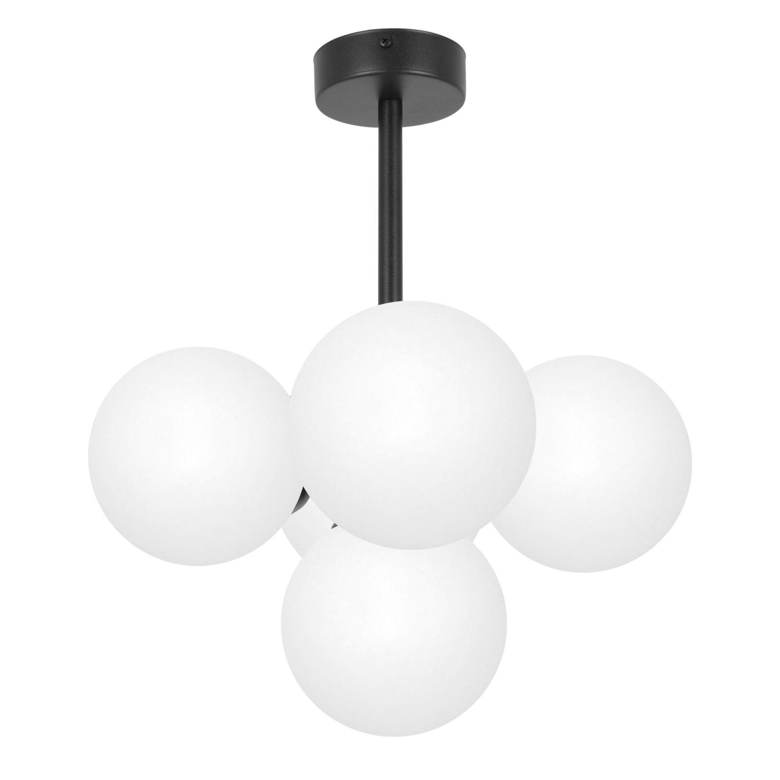 Lampa sufitowa na zdjęciu to elegancki i funkcjonalny element oświetleniowy, który łączy w sobie nowoczesny design z wysoką funkcjonalnością. Jej prostota oraz klasyczne, geometryczne kształty sprawiają, że idealnie wpisuje się w estetykę współczesnych wnętrz. Matowe, kuliste klosze z mlecznego szkła zapewniają równomierne, delikatne oświetlenie, a matowa czarna konstrukcja dodaje jej nowoczesnego charakteru. Do tej lampy dobierz żarówkę w kształcie świeczki. Pamiętaj, aby wybrana żarówka miała wysokość maksymalnie 10,5 cm.