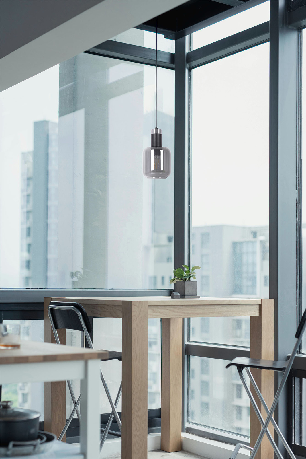 Lampa K-5260 DENIS została wykonana z wysokiej jakości metalu i szkła, co gwarantuje trwałość oraz odporność na uszkodzenia. Jej kolorystyka – połączenie czerni z grafitowym odcieniem szkła – sprawia, że prezentuje się niezwykle elegancko i pasuje do wielu aranżacji wnętrz. Przydymiony szklany klosz o średnicy 13 cm nadaje lampie subtelności, a jednocześnie zapewnia rozproszone, nastrojowe oświetlenie.