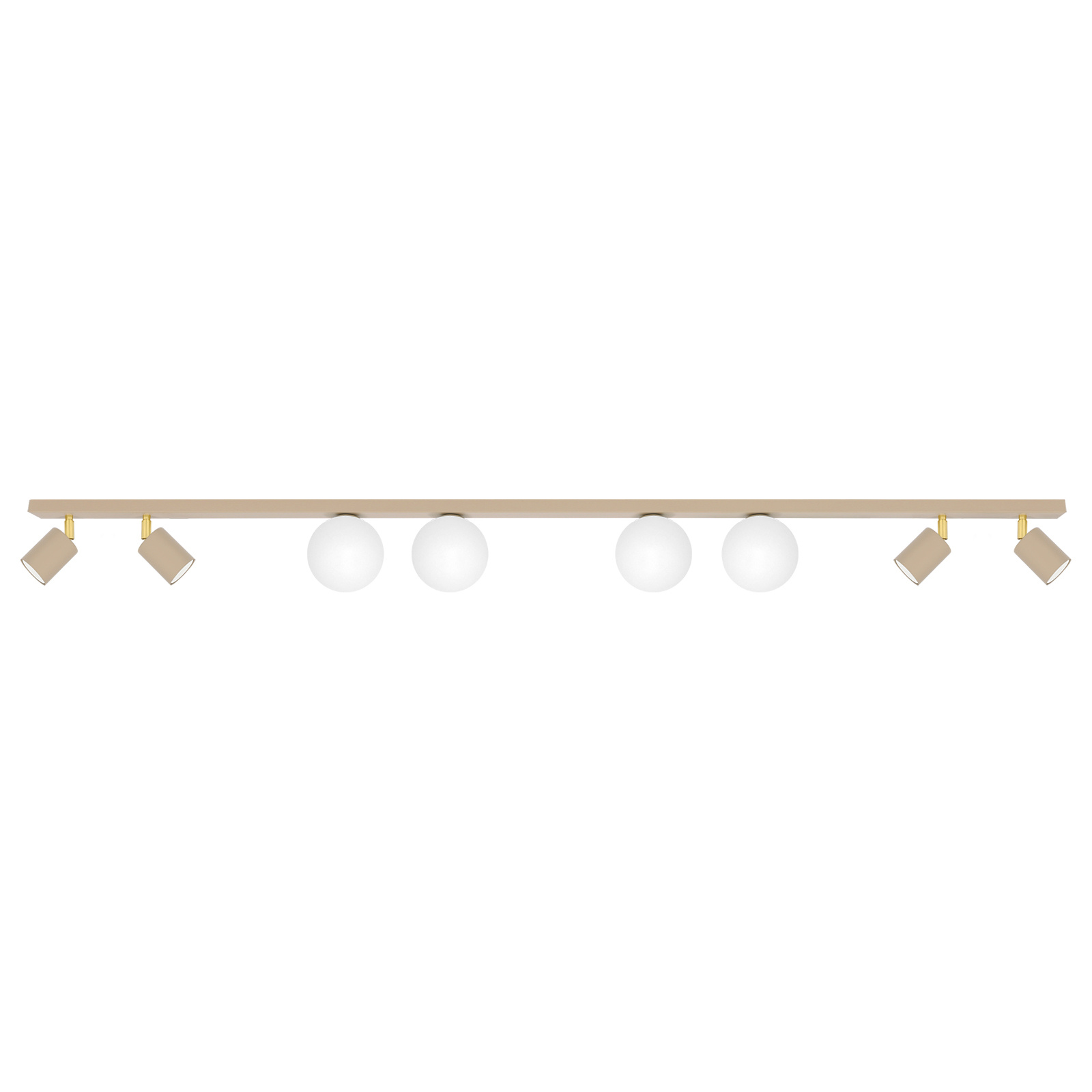 Lampa sufitowa K-5833 to doskonałe połączenie nowoczesnego designu z praktycznym oświetleniem, które sprawdzi się w wielu wnętrzach. Jej metalowa konstrukcja w eleganckim beżowym kolorze oraz szklane, białe klosze tworzą harmonijną kompozycję, wpisującą się w aktualne trendy wnętrzarskie. Model ten składa się z listwy o długości 160 cm, na której centralnie rozmieszczono cztery klosze, a na jej końcach umieszczono cztery ruchome reflektory. Dzięki takiemu układowi światło można skierować w wybrane miejsca, dostosowując oświetlenie do własnych potrzeb.
