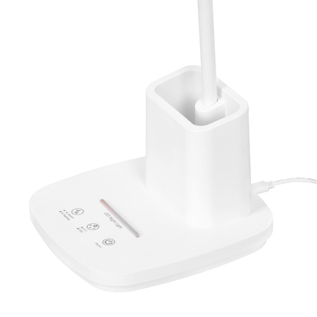 Lampka może poszczycić się kilkoma funkcjami, które z miejsca pokochasz, ale zacznijmy od początku. Pierwszą z zalet jest niezaprzeczalnie silikonowe ramię, dzięki któremu możesz regulować kąt oraz kierunek padania światła – po ustawieniu pożądanej pozycji, pozostaje w niej. Dodatkowo, posiada wbudowany pojemnik – piórnik, w którym możesz trzymać niezbędne rzeczy.