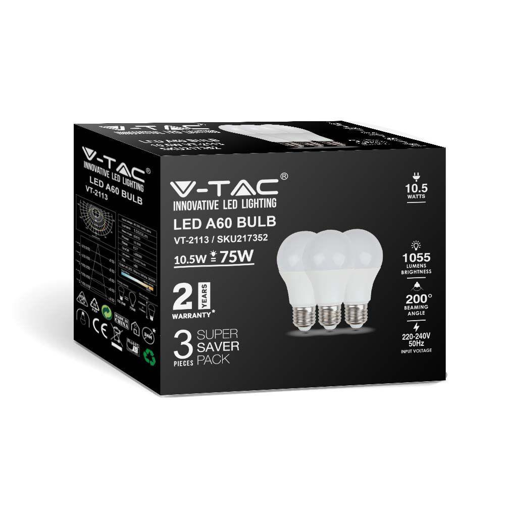 Żarówka LED V-TAC 10,5W E27 A60 (Opak. 3szt) VT-2113 2700K 1055lm