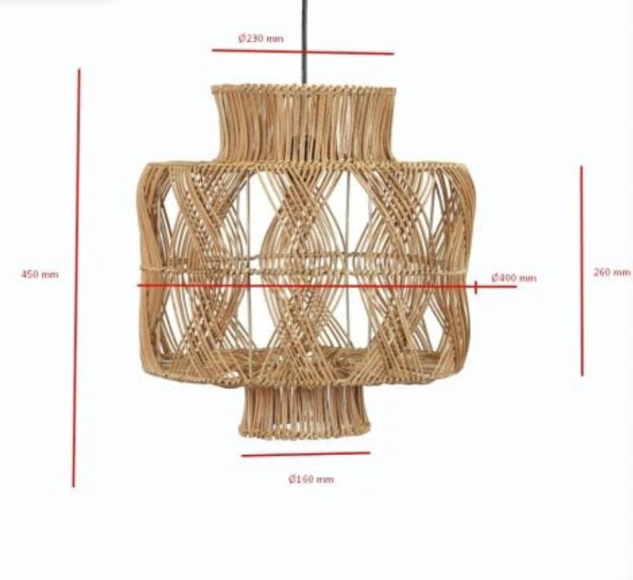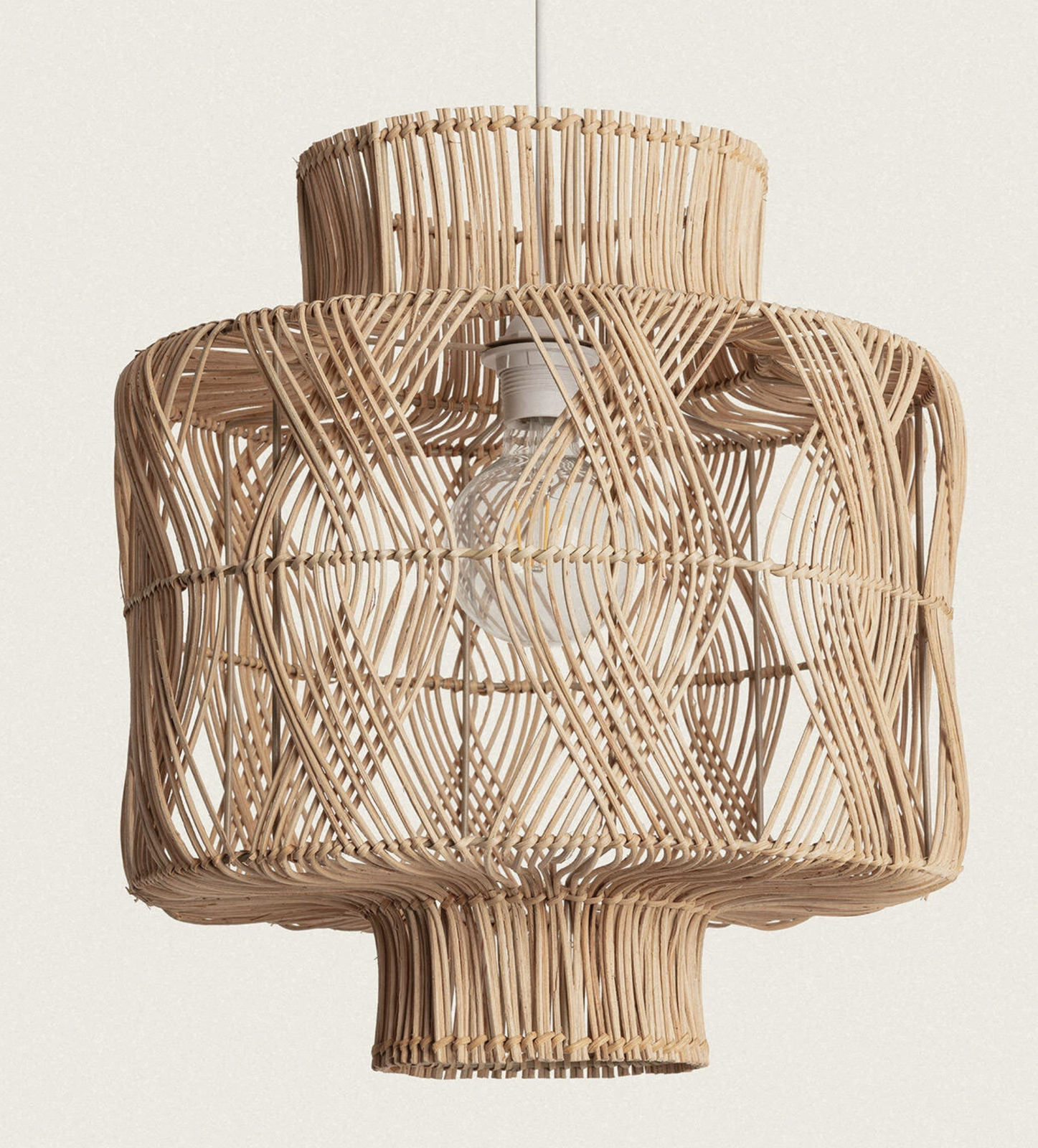 Wykonana z naturalnego ratanu, lampa wykorzystuje wytrzymałość i elastyczność tego materiału do stworzenia klosza o starannie zaprojektowanej geometrii i ręcznie plecionym splocie, który w wyjątkowy sposób filtruje światło. Każdy egzemplarz jest unikalny, ponieważ jako produkt ręcznie wykonany z naturalnych włókien może różnić się wykończeniem, co podkreśla jego ekskluzywność i wartość rzemieślniczą.