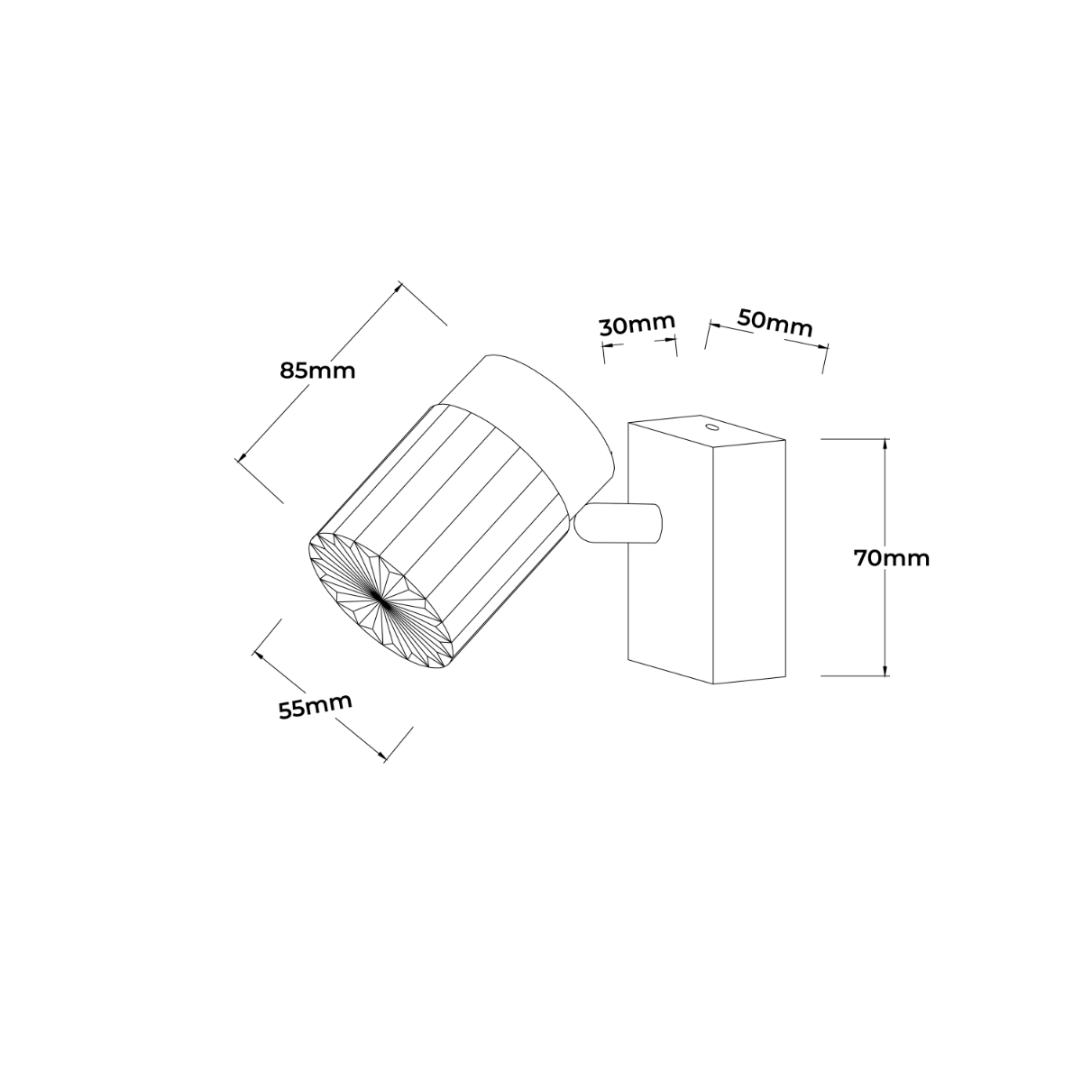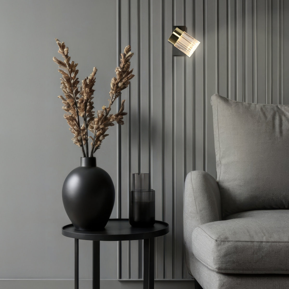 Styl i design: Regulowany spot w złotym wykończeniu z ryflowanym akrylem.Materiały: Metal, akryl.Wymiary: 8,5 × 5,5 × 14 cm (szer. × gł. × wys.).Źródło światła: Zintegrowane LED 6W.Strumień świetlny: 717 lm / 743 lm / 709 lm (w zależności od barwy).Barwa światła: CCT 3000K / 4000K / 6000K (regulowana).Klasa energetyczna: E.Zastosowanie: Salon, sypialnia, korytarz, strefy do czytania i akcentowego doświetlenia.