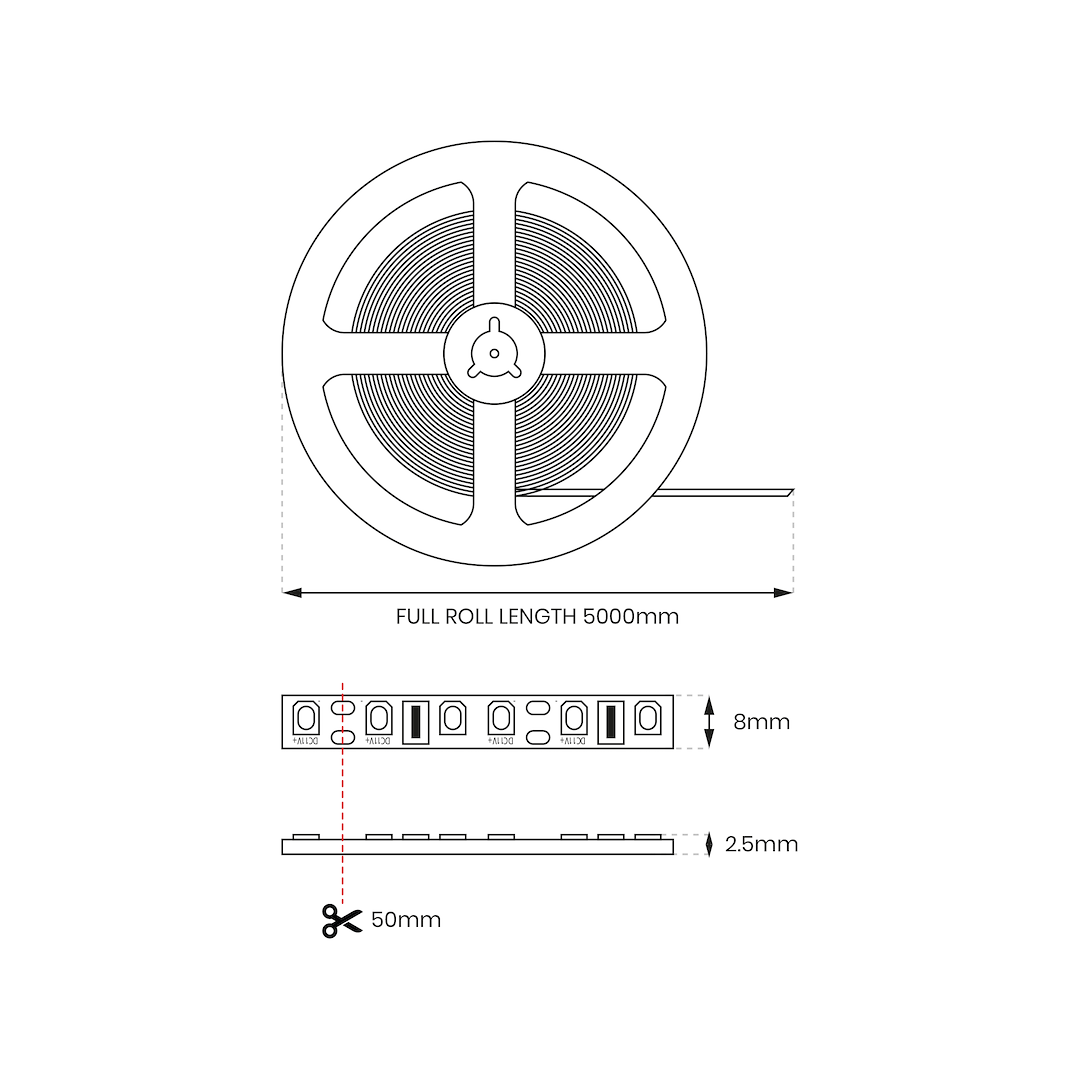 Taśma składa się z 600 diód LED SMD (120/m) i ma mozliwość cięcia w wyzanczonych do tego punktach co 2,5cm.