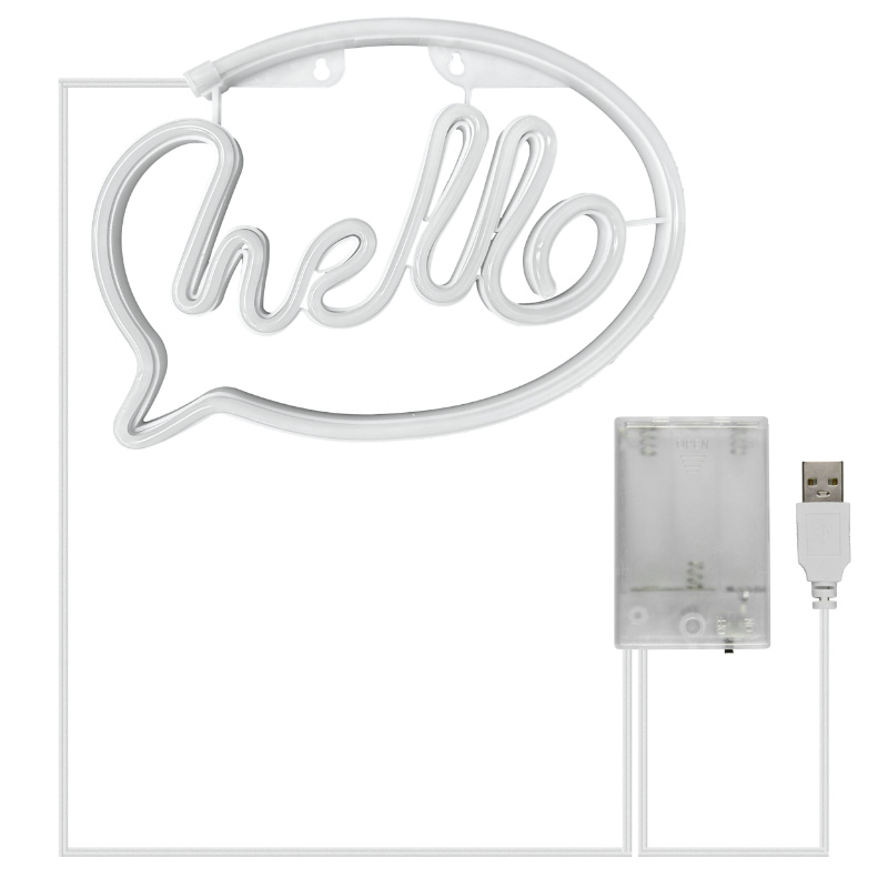 ,Neon dekoracyjny LED "hello". Zasilanie: bateryjne (3 x AA - brak w zestawie) lub USB (DC 5 V, 1 A). Wyłącznik zasilania. Wymiary: 40 x 24 cm. Opakowanie: pudełko.