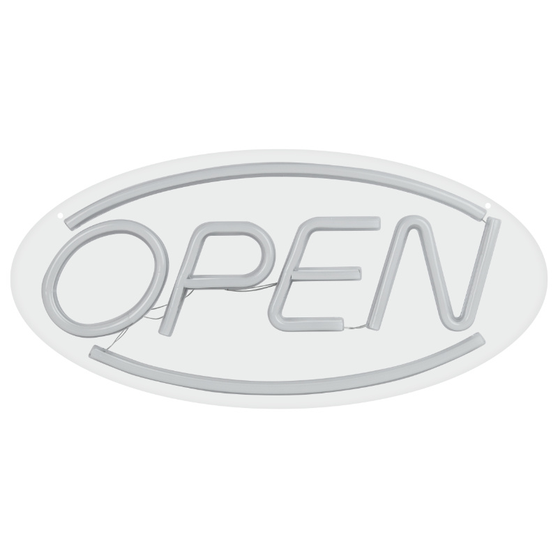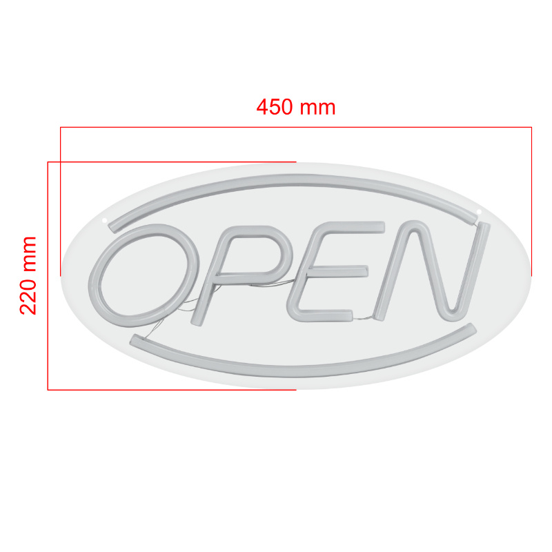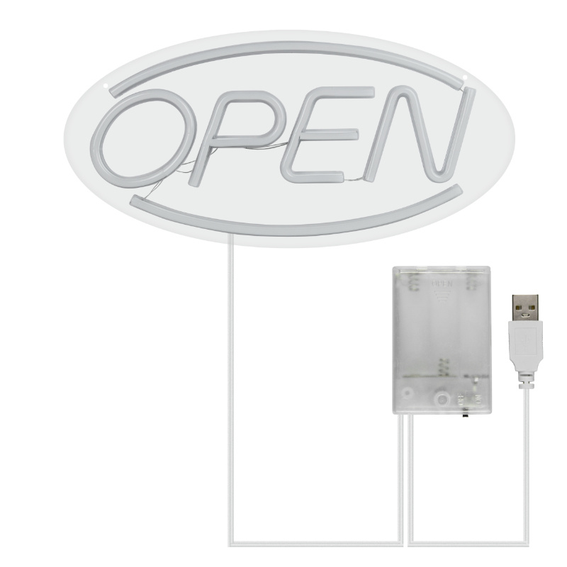 ,Neon dekoracyjny LED " open ". Zasilanie: bateryjne (3 x AA - brak w zestawie) lub USB (DC 5 V, 1 A). Wyłącznik zasilania. Wymiary: 40 x 24 cm. Opakowanie: pudełko.