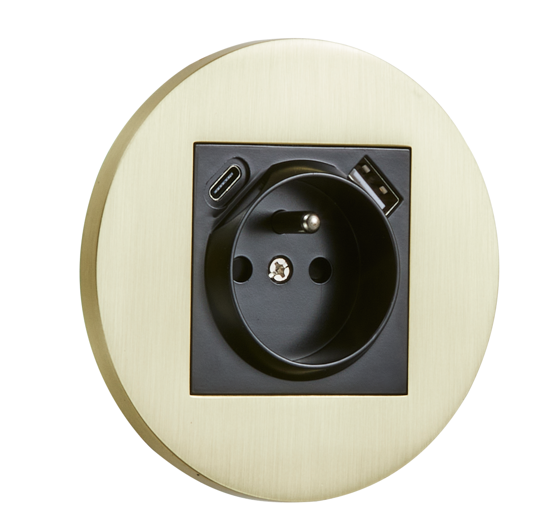 Gniazdo z bolcem + USB + USBC podtynkowe okrągłe metalowe TOGGLICA ROUND złoty szczotkowany