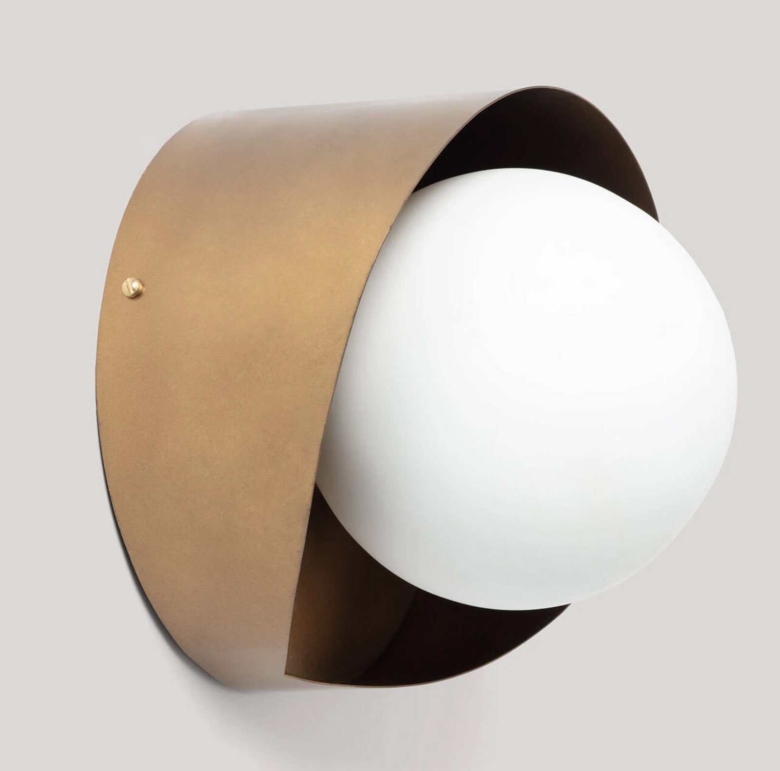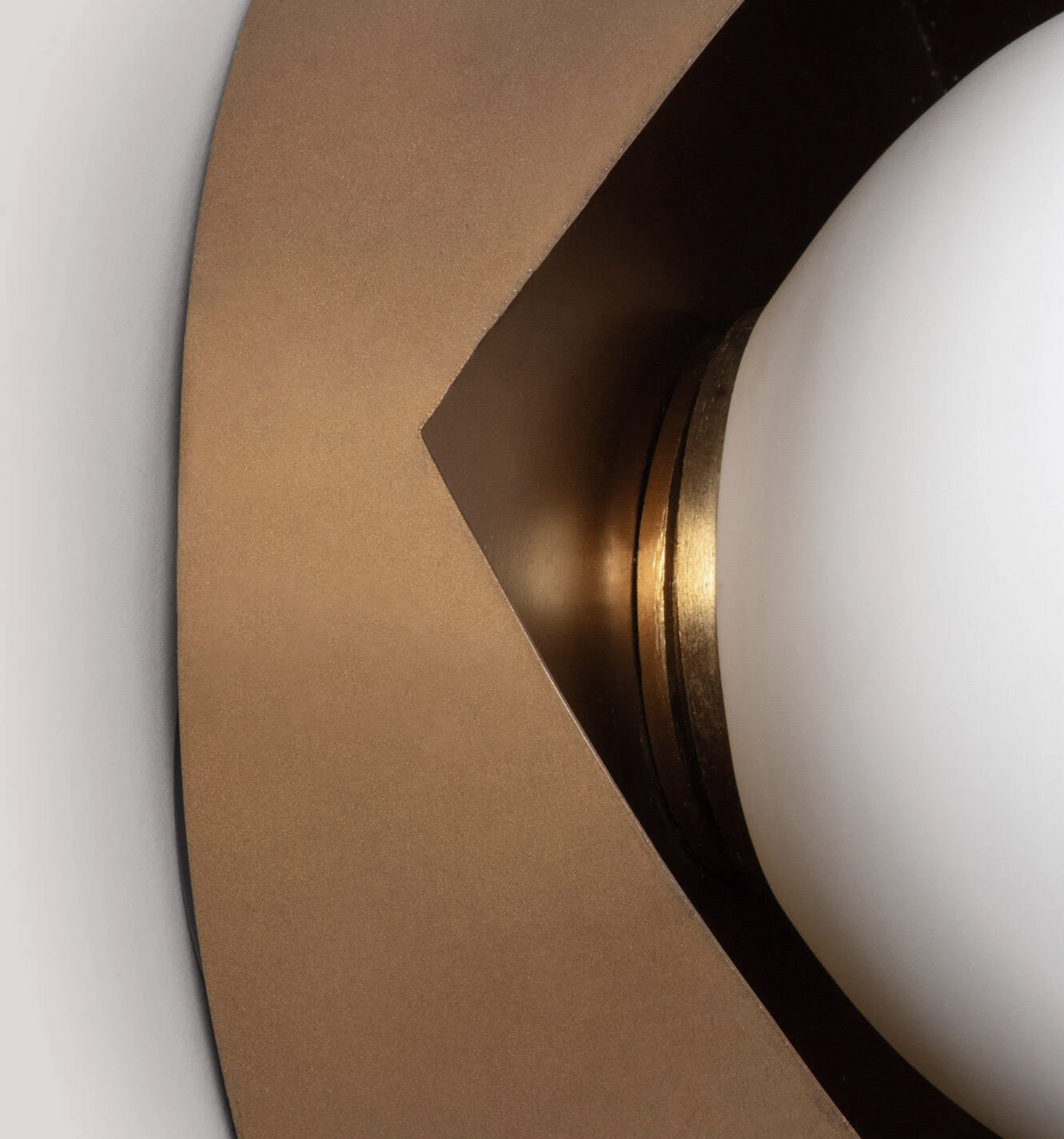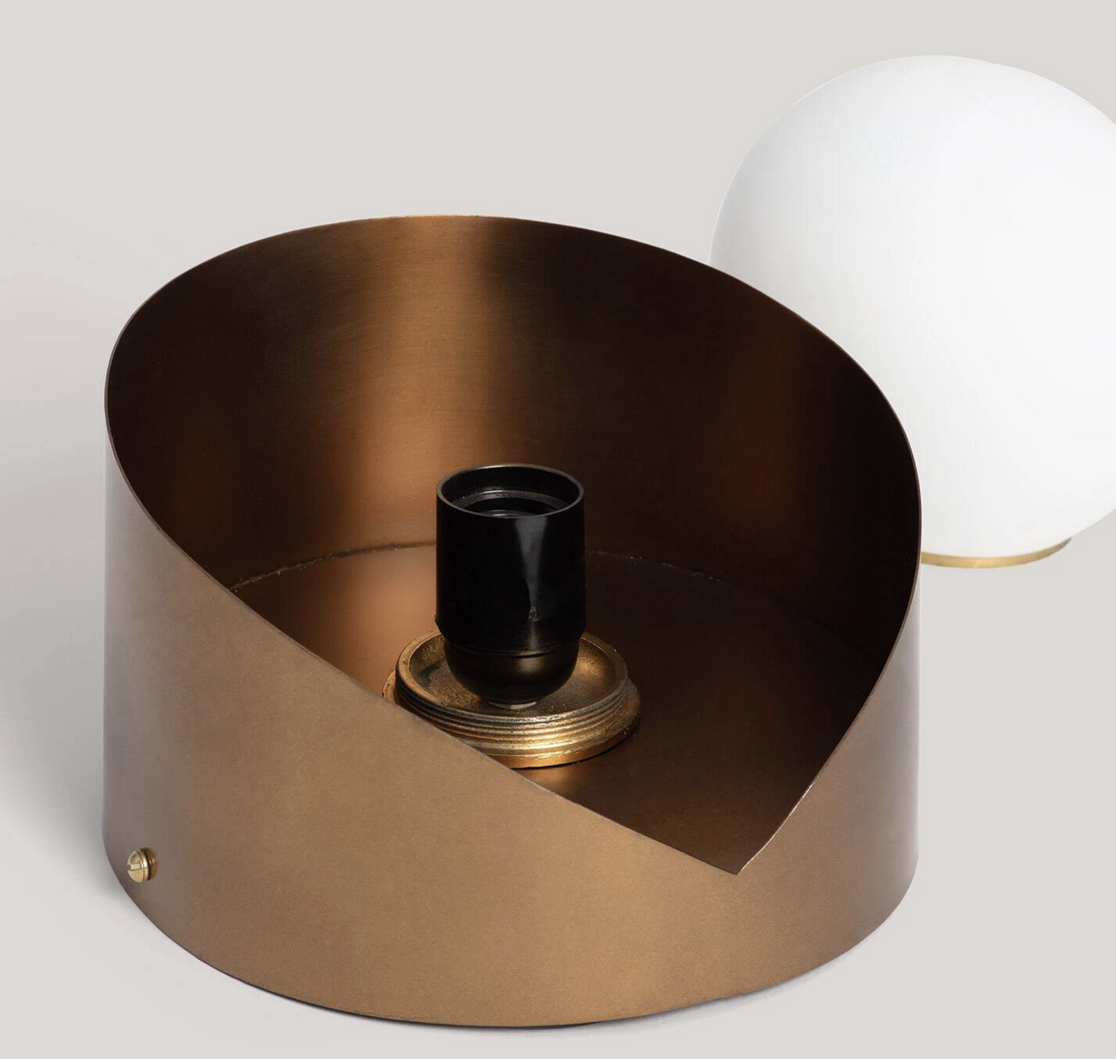 Metalowa konstrukcja z brązowym wykończeniem prezentuje płynną i asymetryczną sylwetkę, inspirowaną formami natury, natomiast opalizujący, kulisty dyfuzor ze szkła zmiękcza światło, tworząc miękką i otulającą iluminację. Wymaga żarówki E27 (brak w zestawie), co pozwala dostosować rodzaj światła do pożądanego nastroju.