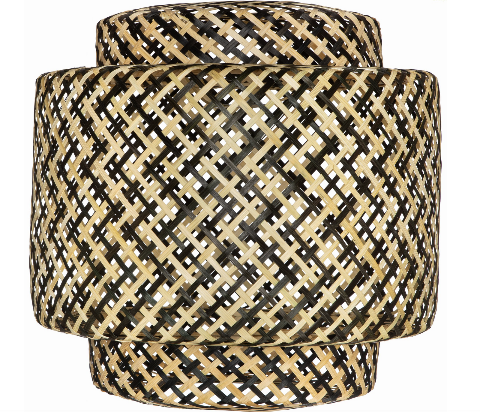 ,Klosz lampy został ręcznie wykonany z drewna bambusowego dwukolorowego. Trzy części klosza są zintegrowane tworząc piękną lampę w całości. Dzięki swoim rozmiarom lampa znakomicie sprawdzi się jako główne oświetlenie salonu, kuchni czy sypialni. Plecionka pozwala przenikać światłu dzięki czemu lampa tworzy piękny klimat w pomieszczeniu.