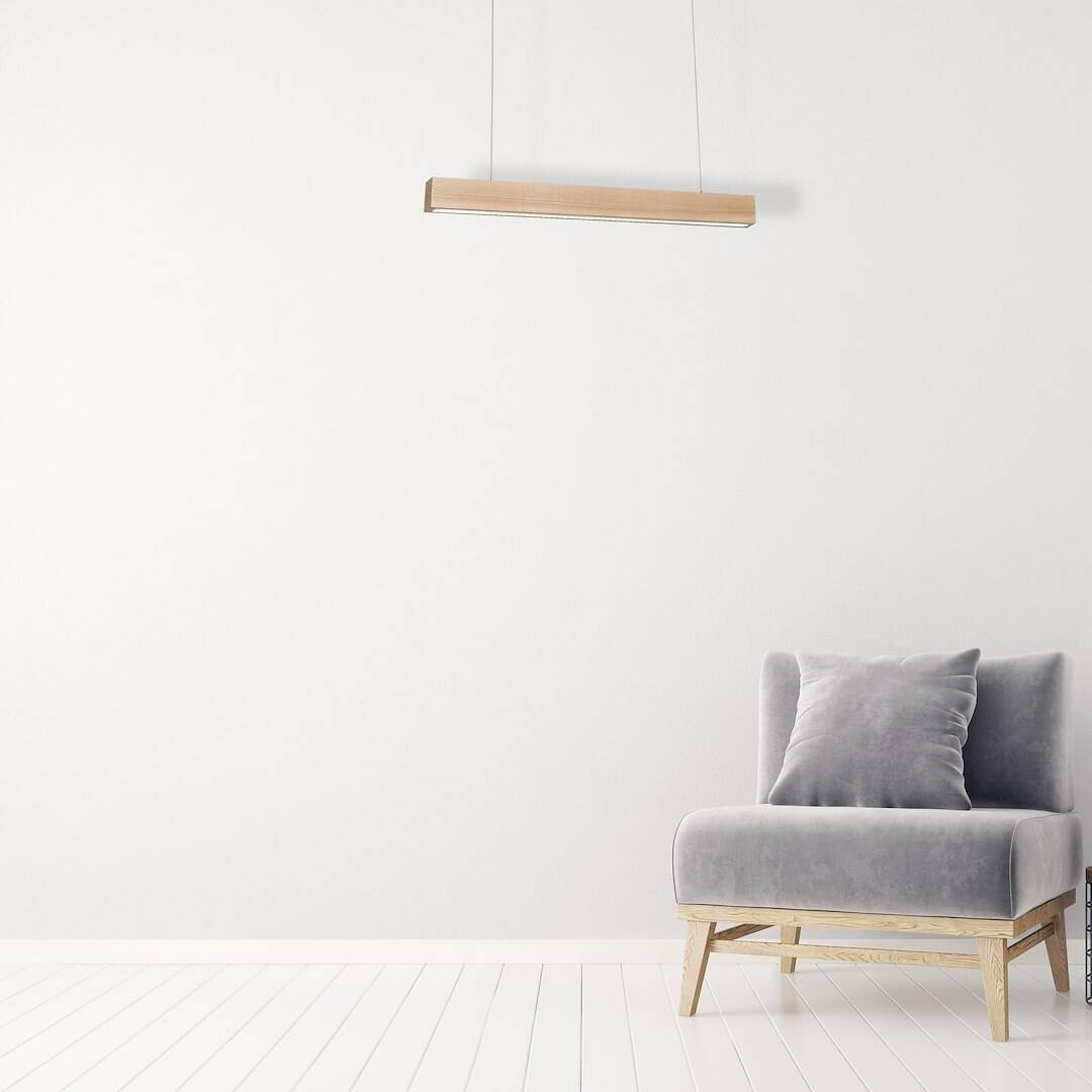 Lampy sufitowe z kolekcji Timber posiadają wbudowane źródło światła świecące przyjemną dla oka barwą 3000 K. Jasność dla krótszej 60 cm listwy wynosi 840 lm, a moc ma 12 W. Dla listwy dłuższej parametry te wynoszą odpowiednio 1260 lm i 18 W. Lampy zostały wykonane z wysokiej jakości materiałów: metalu, drewna i akrylu. W skład kolekcji Timber wchodzą dwie wiszące lampy sufitowe wykończone w kolorze naturalnego drewna. Lampy mają formę wąskiej, podłużnej listwy o długości 60 lub 90 cm. W dolnej części oprawy wbudowano moduł LED. Listwa świetlna została zamontowana na regulowanych zawiasach, dzięki którym można regulować wysokość jej zwisu od 50 do 90 cm.