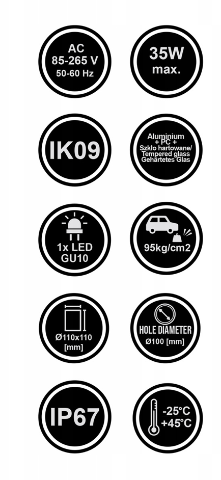,Oprawy najazdowe przeznaczone są do montażu dogruntowego głównie przy podjazdach, alejkach i ścieżkach. Szerokie zastosowanie połączone z wymiennym źródłem światła zapewnia długie użytkowanie naszych opraw. Produkt został wyposażony w gniazdo GU10 o maksymalnej mocy źródła światła 35W Produkt posiada klasę odporności IP67 IK09, dzięki czemu idealnie sprosta wyzwaniom pracy na zewnątrz budynków. Produkt standardowo posiada 1 dławik, w zestawie znajduje się dodatkowy dławik dzięki któremu można połączyć oprawy w linię.
